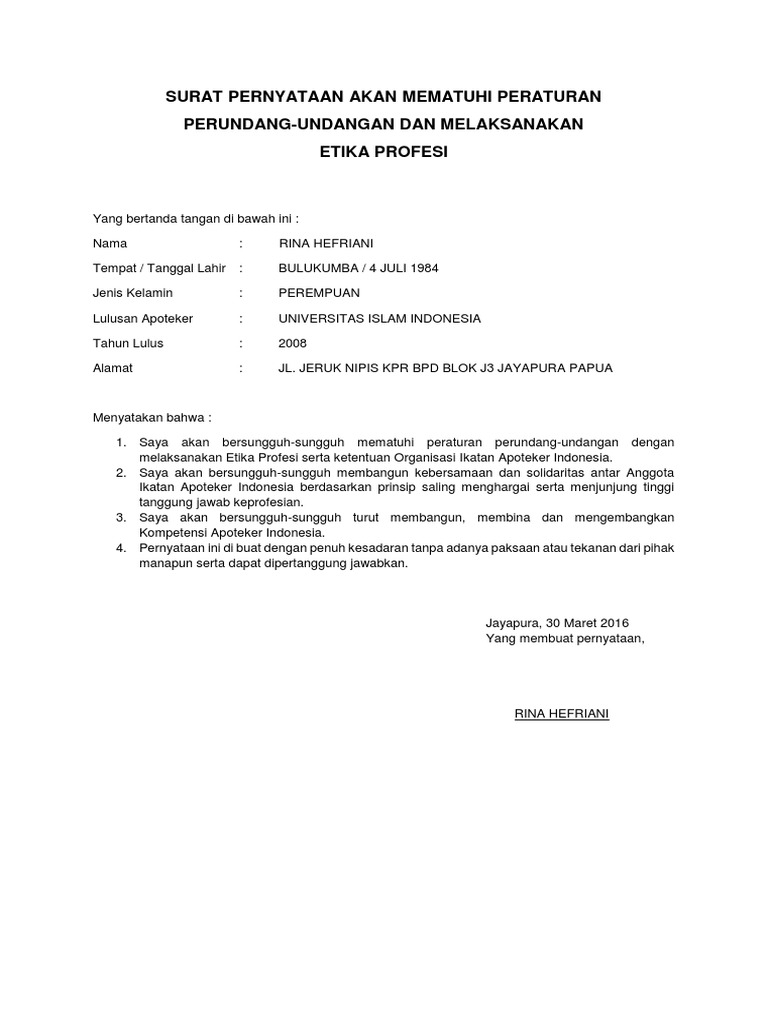 Contoh Surat Pernyataan Menaati Segala Peraturan Perundang-Undangan - Foto Contoh Surat Pernyataan Yang Merawat Almarhum Dari - Cuitan Dokter. Contoh atas peraturan daerah yang menampung kekhususan daerah seperti qanun di provinsi nanggroe aceh darussalam. Contoh surat pernyataan tidak sedang bekerja. Menyajikan contoh surat pernyataan kerja, contoh surat pernyataan diri, contoh surat c. Penutup surat pernyataan yang terdiri dari: Sanggup dan bersedia mentaati peraturan yang berlaku pada praktikum rangkaian logika.